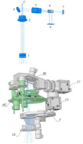 The optical layout of the ESPriF spectral module is shown in the figure on the top-right. A divergent light beam with an aperture of A=1:4 from the entrance slit S enters the lens collimator CL . Next, the collimated beam reaches the echelle grating E , which operates outside the principal plane. The light then hits the cross-dispersion diffraction grating G , located in close proximity to the collimator. The cross-dispersion diffraction grating provides the necessary separation of spectral orders at the long-wavelength part of the operating range. Additional separation of the short-wavelength orders is produced by the prism P. Subsequently, the camera CM forms a spectral image on the CCD detector. The collimator is a three-lens apochromat. Its focal length is 300 mm, and the aperture diameter is 75 mm. The collimator objective assembly is equipped with a micrometer focusing mechanism because the astigmatism introduced by the echelle gratings with a large blaze angle is sensitive to the collimation quality of the incident beam. The echelle grating has a blaze angle of θ_B = 72° (tan θ B = 3.08 ), and the ruled surface dimensions are 250 x 80 mm. The average diffraction angle is equal to the angle of incidence, i.e., β = α = θ B , and the angle between the principal plane of the echelle and the axis of the incident beam is γ = 7.5° . Thus, the average tilt angle of the spectral lines is χ ~ 40° . The cross-dispersion unit consists of two optical elements: a reflecting diffraction grating operating in the first order, and a prism. The combination of a prism and a diffraction grating is used to utilize the detector’s working area more effectively. The parameters of the prism and the diffraction grating were chosen to enable simultaneous recording of the 3800–10,800 ÅÅ range, with order separation sufficient for the use a polarization analyzer or an image slicer without requiring reconfiguration of the spectrograph layout. The entire operating range covers 49 spectral orders. Scheme of the spectrograph's input module (IM) The central figure on the right shows the light-path; the lower figure shows the main components and assemblies: 1 and 2 elements of the afocal reducer, 3 the slit (decker) position, 4 and 5 decker viewing optics, 6 beam splitter elements of the defocusing detector, 7 and 8 decker viewing sensors. LC lens-based pre-focal collimator, T turret with phase-shifting plates and a flip prism for calibration light, AG auto- guiding module with a movable objective, BS interchangeable set of slits (0.5”, 0.75”, and 1.0”), C1 input slit viewing camera, C2 autofocusing channel. Structural elements are not shown.
