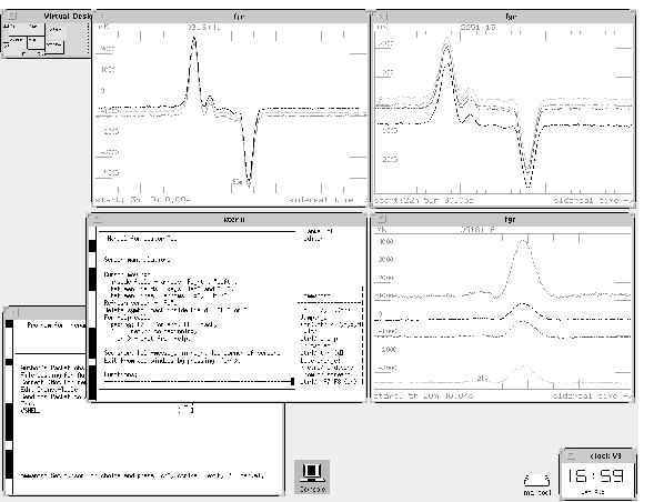 На рис. [*] отображены фрагменты записей вышеперечисленных источников. Видна высокая повторяемость результатов ото дня ко дню и отсутствие координатных смещений. Поскольку начало записей было выбрано разным в разные дни, то это наглядно свидетельствует об отсутствии потерь отсчетов данных, что обычно не гарантировано на IBM-PC. В левой части экрана видны фрагменты программных меню подготовки данных авторского пакета.